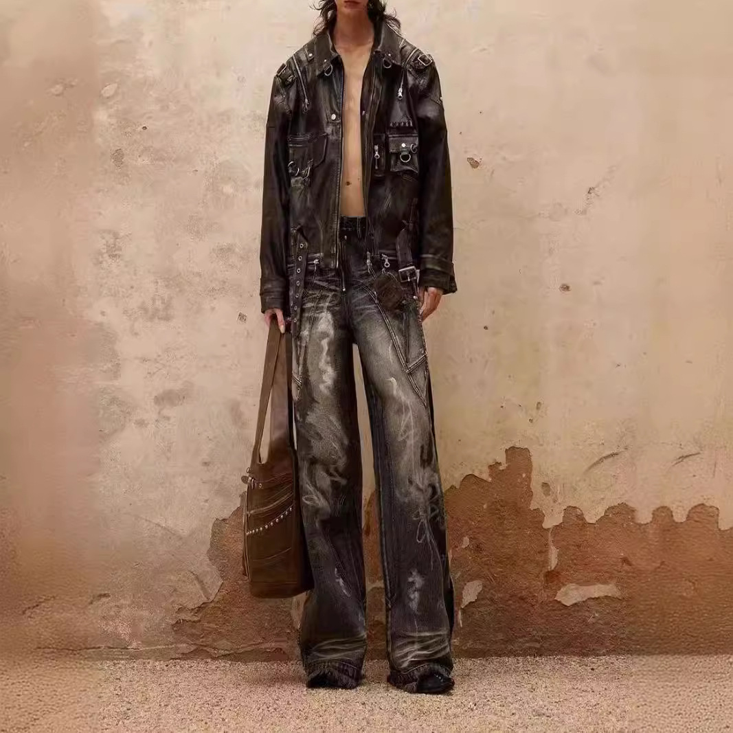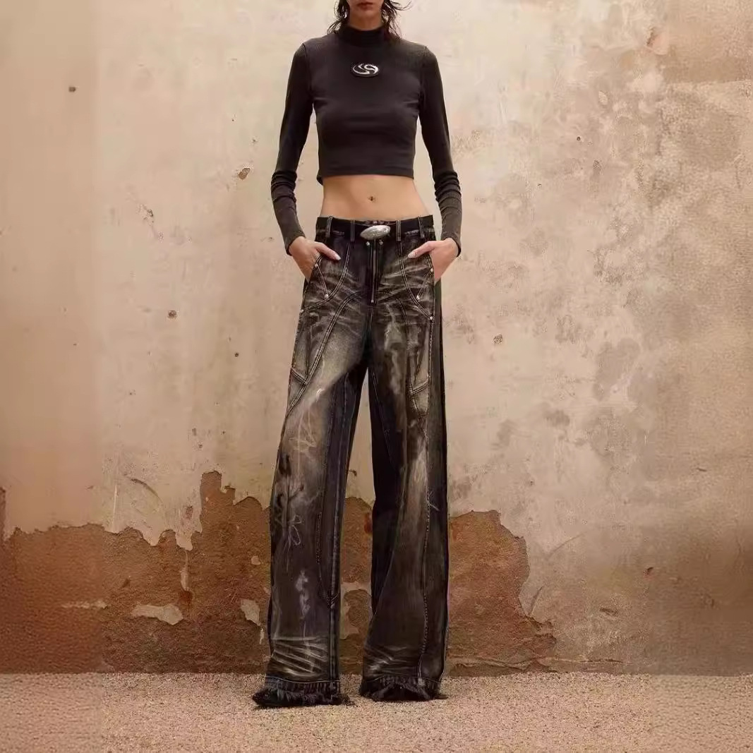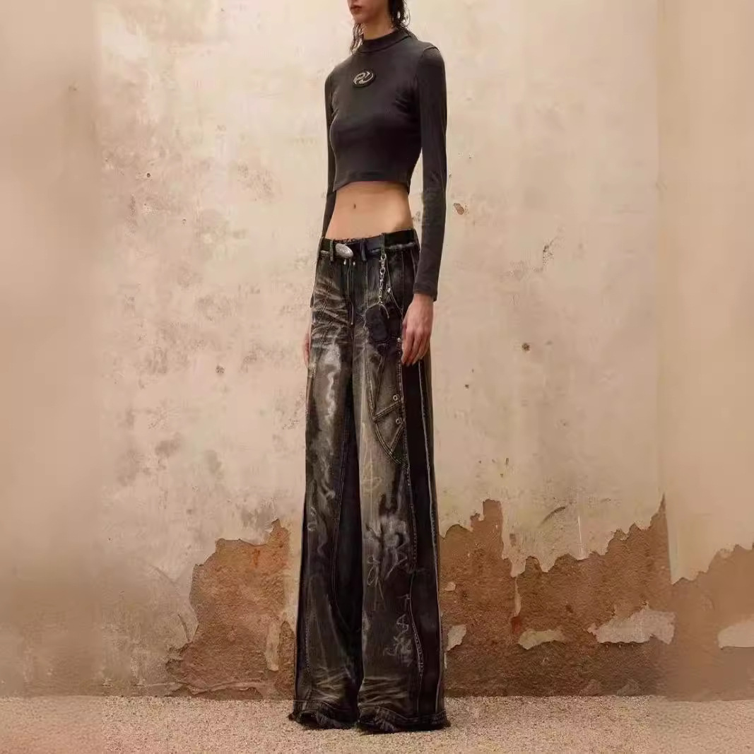 | nameOriginal | American-style Retro Disordered Mark Graffiti Profile Jeans Women's All-match Design Sense Dipped Floor-standing Wide-leg Pants Trousers |