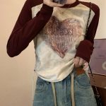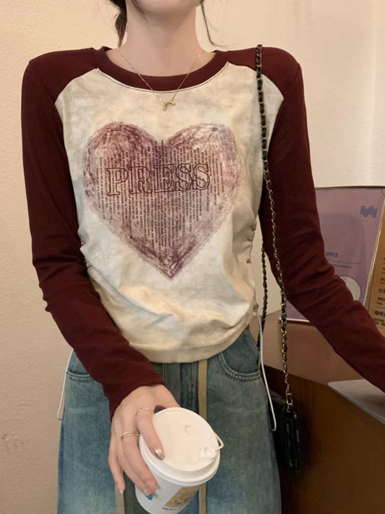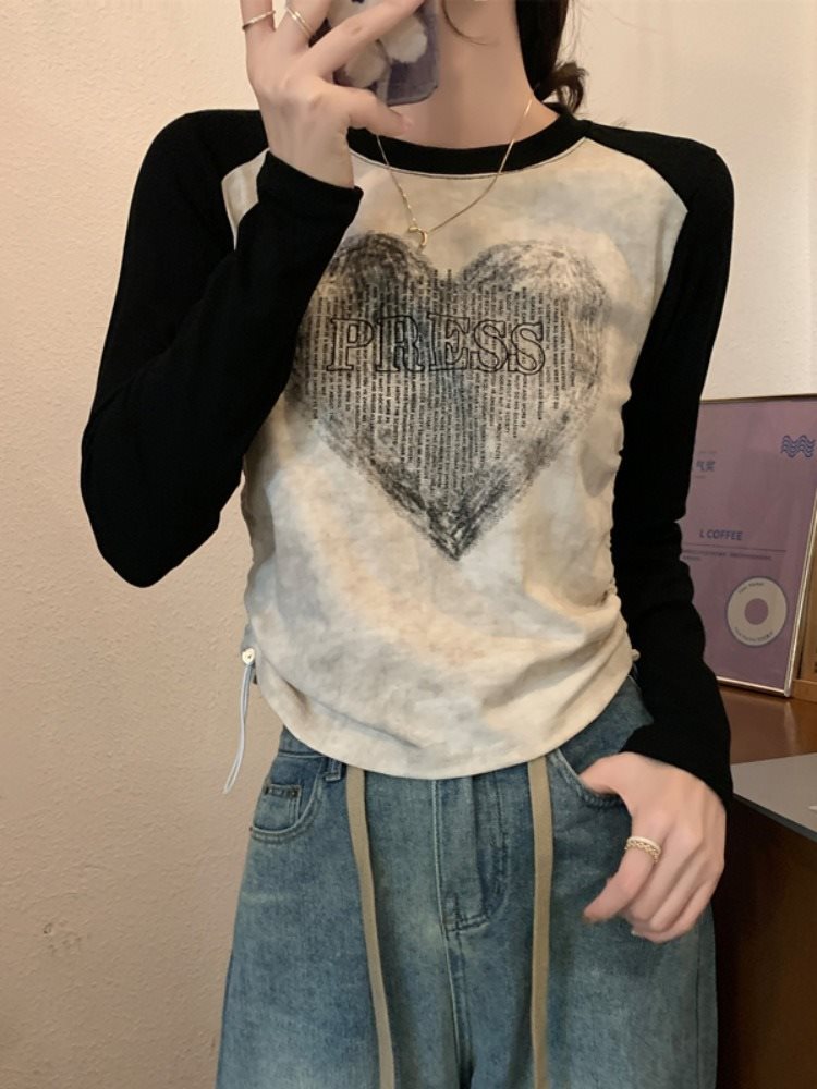 | nameOriginal | American Style Retro Printed T-shirt Women's Inner Design Side Pleated Base Shirt Shoulder Raglan Sleeve Cotton Top |