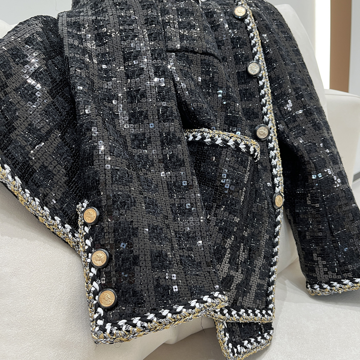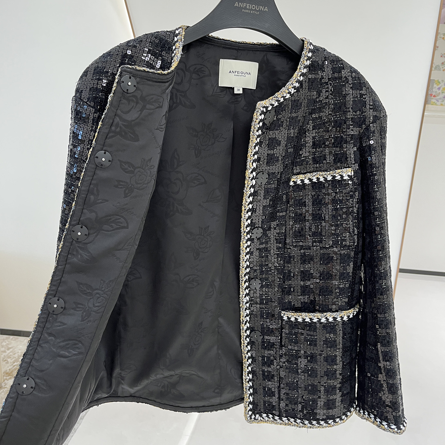Anfei Ona spring and autumn small fragrant cotton polyester tweed heavy industry sequin woven exquisite lace women's coat
