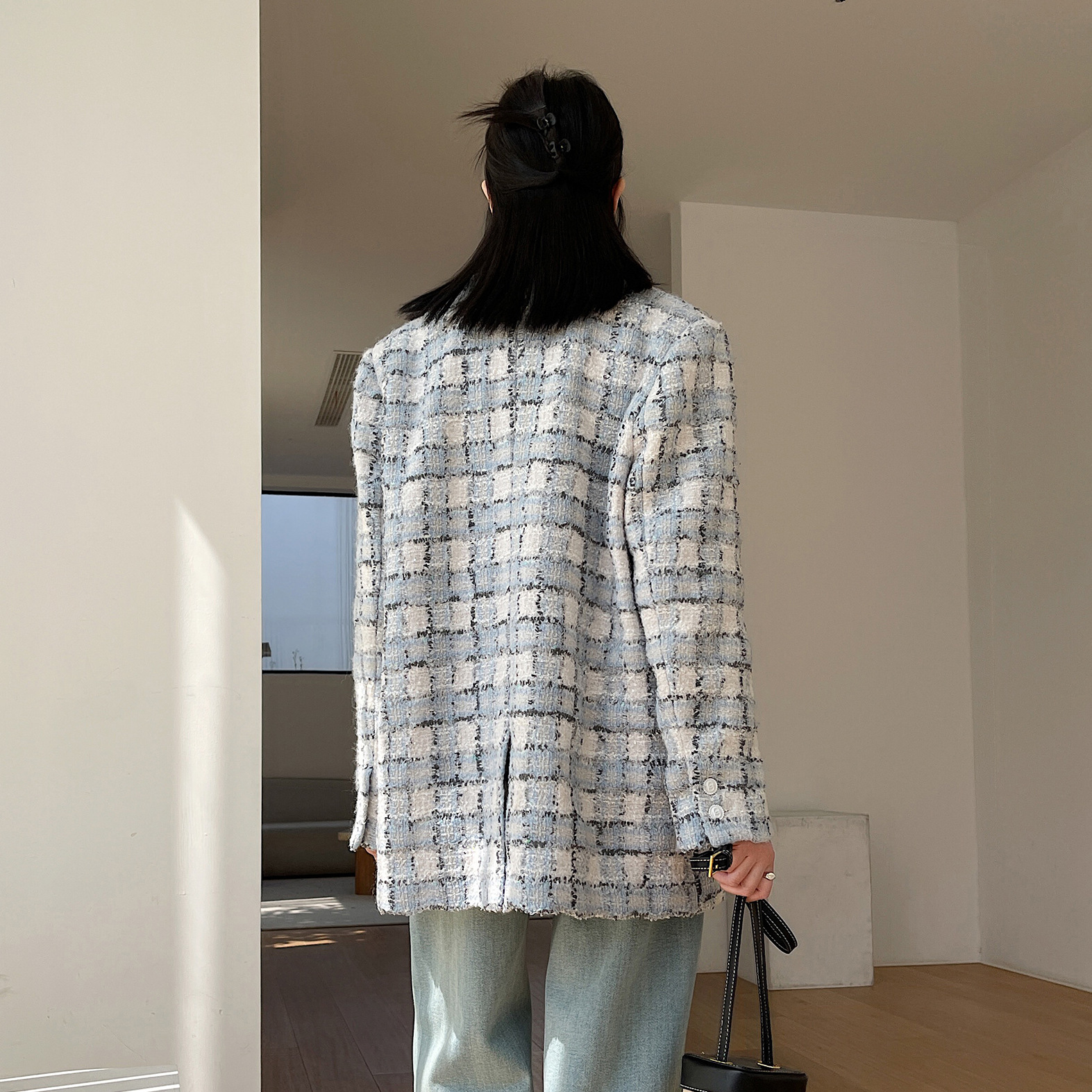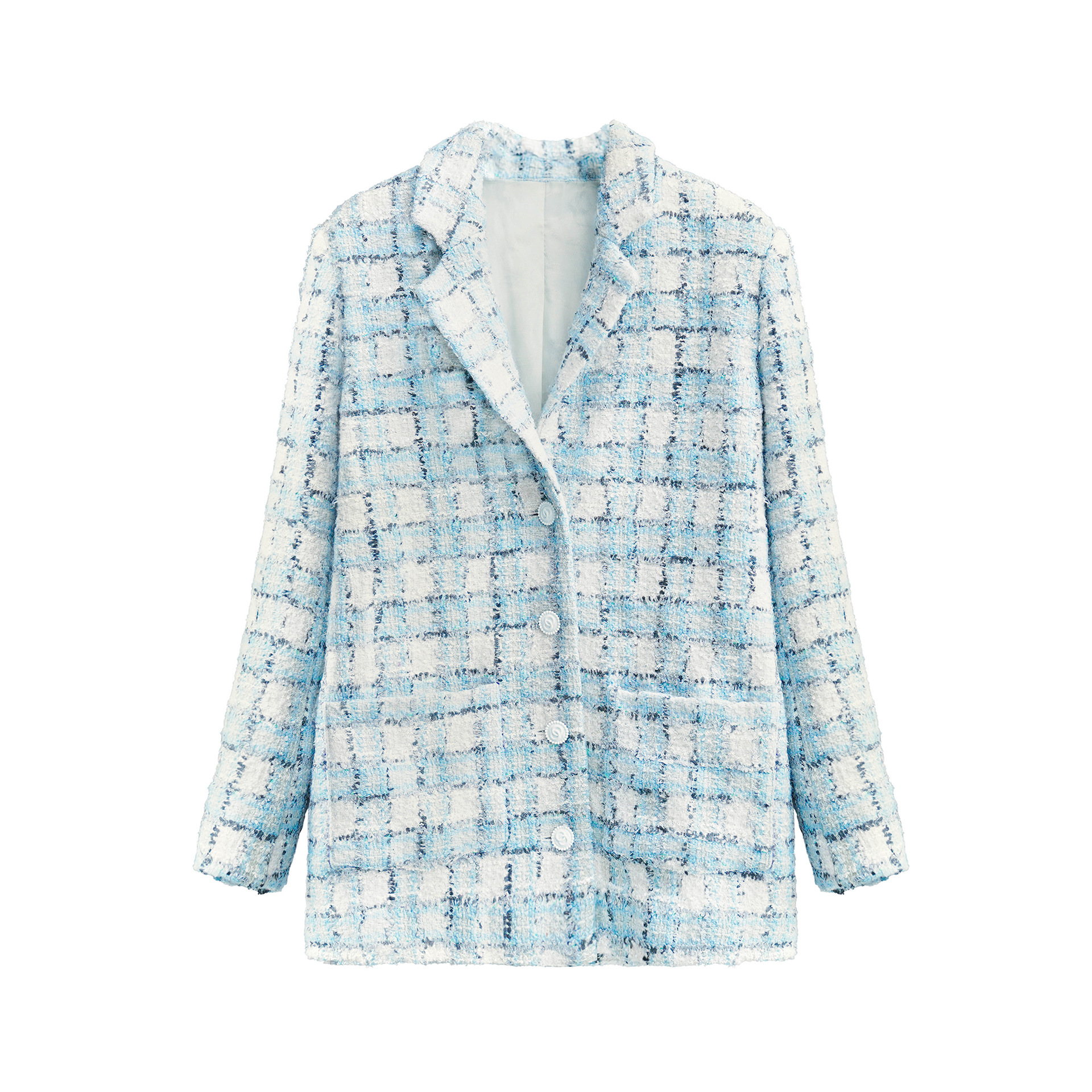 | nameOriginal | Anfeiona 2024 New French style small fragrance wool polyester blue and white plaid tweed suit collar mid-length women's coat |