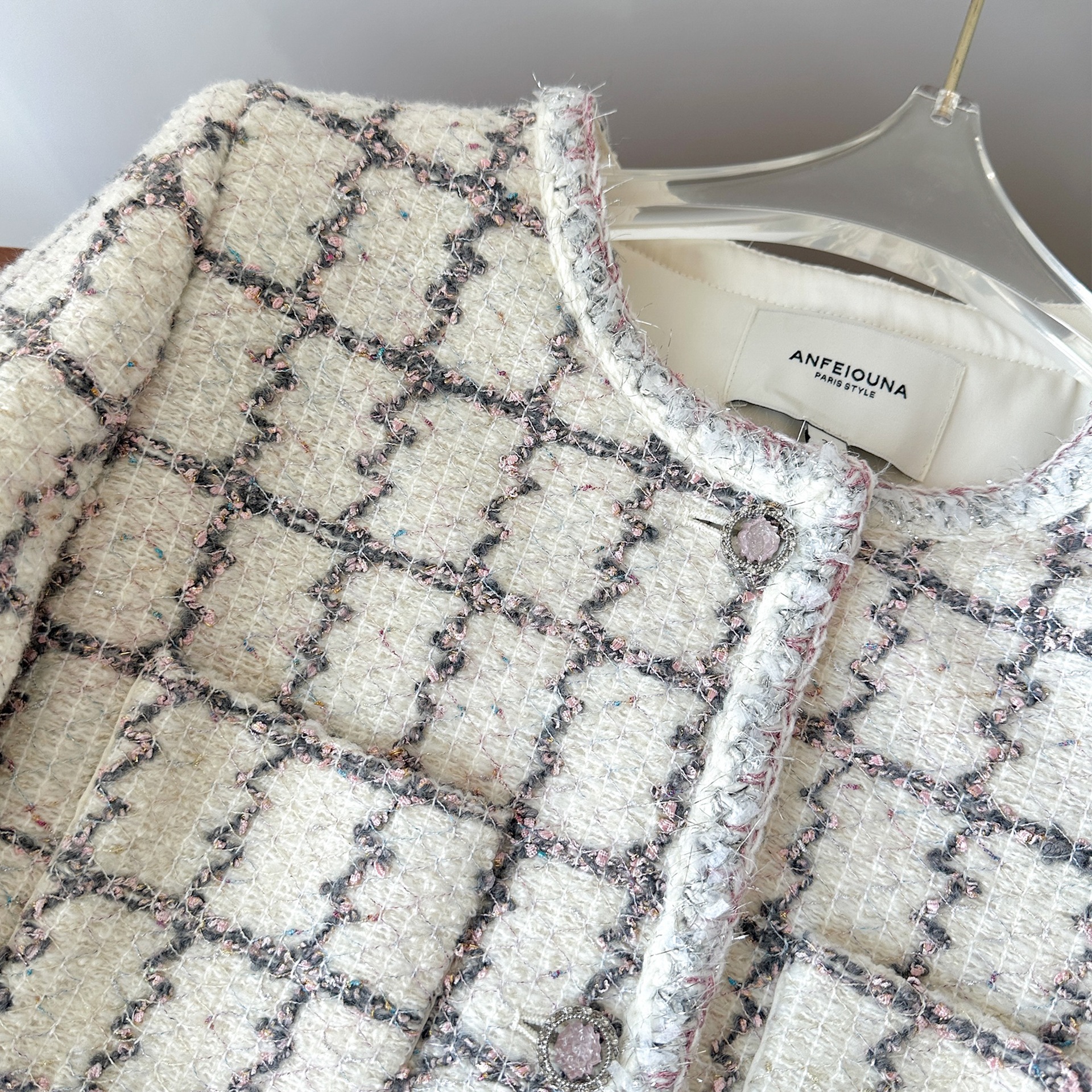 Anfiona 2024 معطف نسائي جديد على الطراز الفرنسي من مزيج الصوف المعطر من نسيج التويد الوردي والشعر الدانتيل