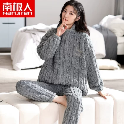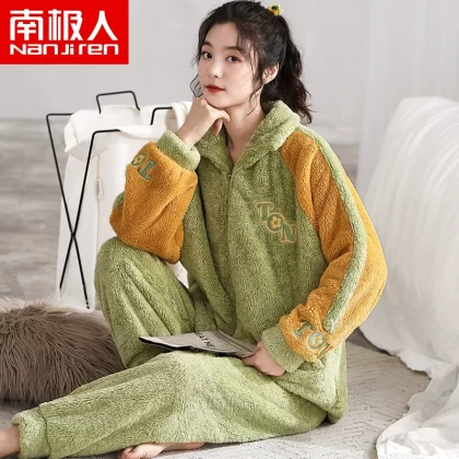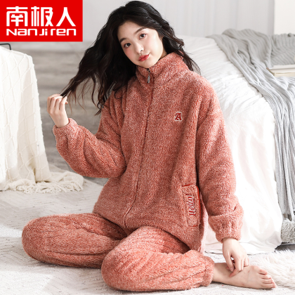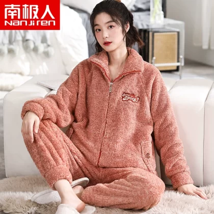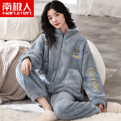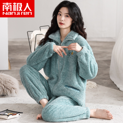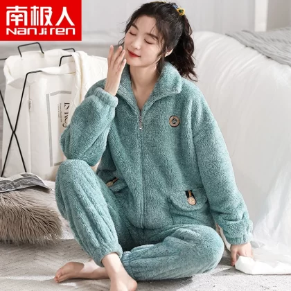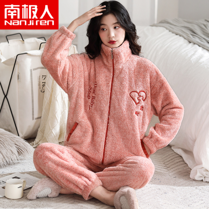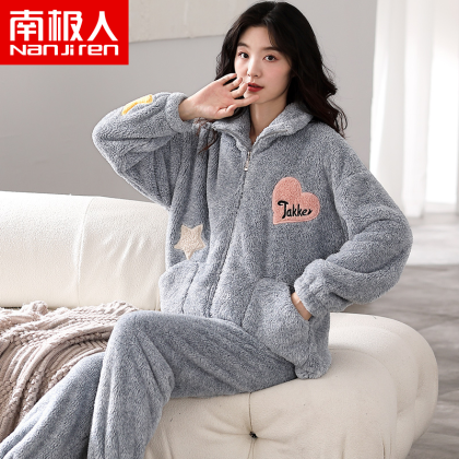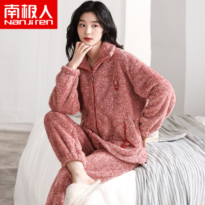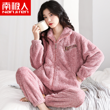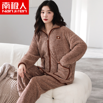Antarctic coral velvet pajamas for women winter zipper home clothes plus velvet warm flannel large size can be worn outside the suit