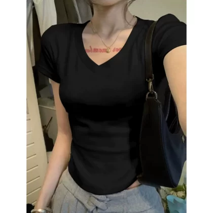| nameOriginal | Apricot inner V-neck right shoulder short-sleeved T-shirt for women summer 2023 new pure lust hot girl slim short top trendy |