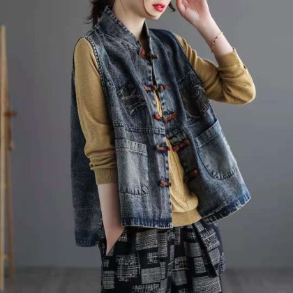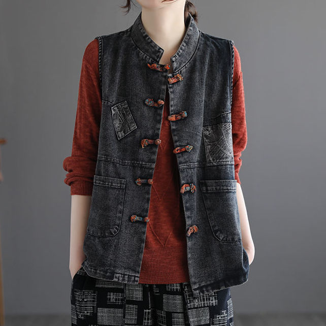 Artistic Retro Large Size Ethnic Style Buckle Denim Vest Women's Spring and Summer Outer Wearing Vest Casual Waistcoat