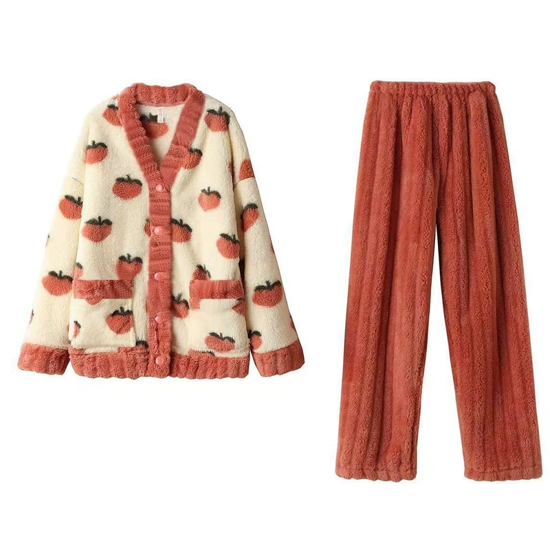 nameOriginal | Autumn and winter flannel coral velvet embroidered peach strawberry home wear pajamas girl plus velvet thickening suit |
