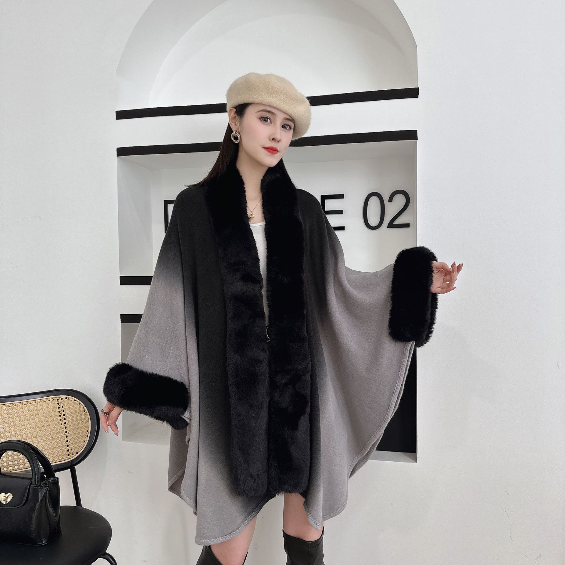 | nameOriginal | Autumn and Winter Imitation Rex Rabbit Fur Collar Gradient Imitation Cashmere Shawl plus size Knitted Cardigan Women's Irregular Cape Cloak Open |