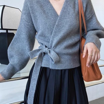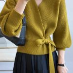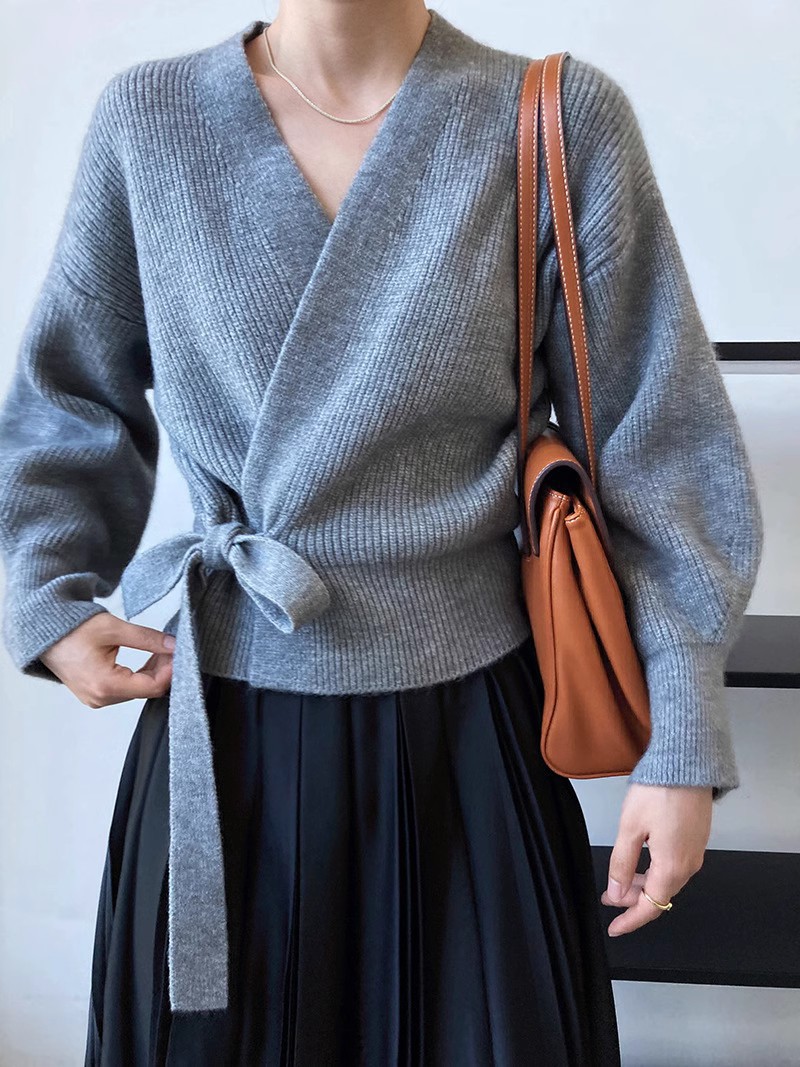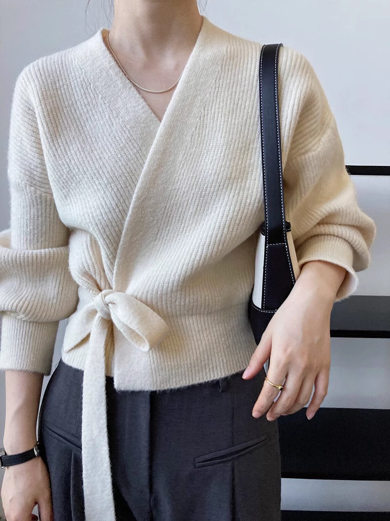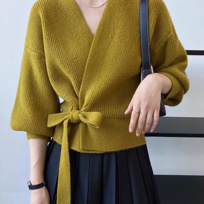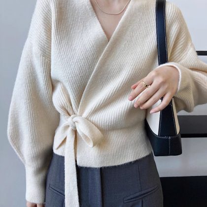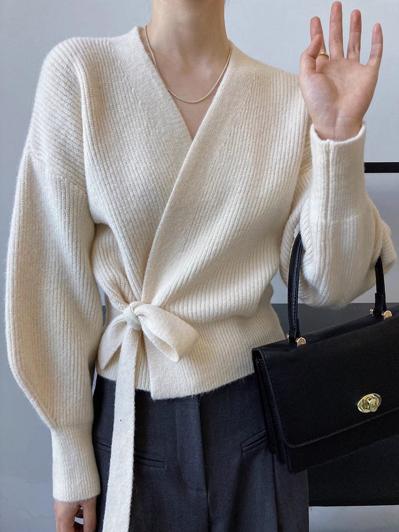 | nameOriginal | Autumn and Winter new women's V-neck pure wool knitted loose cardigan lace-up fashion puff sleeve outer sweater coat fashion |
