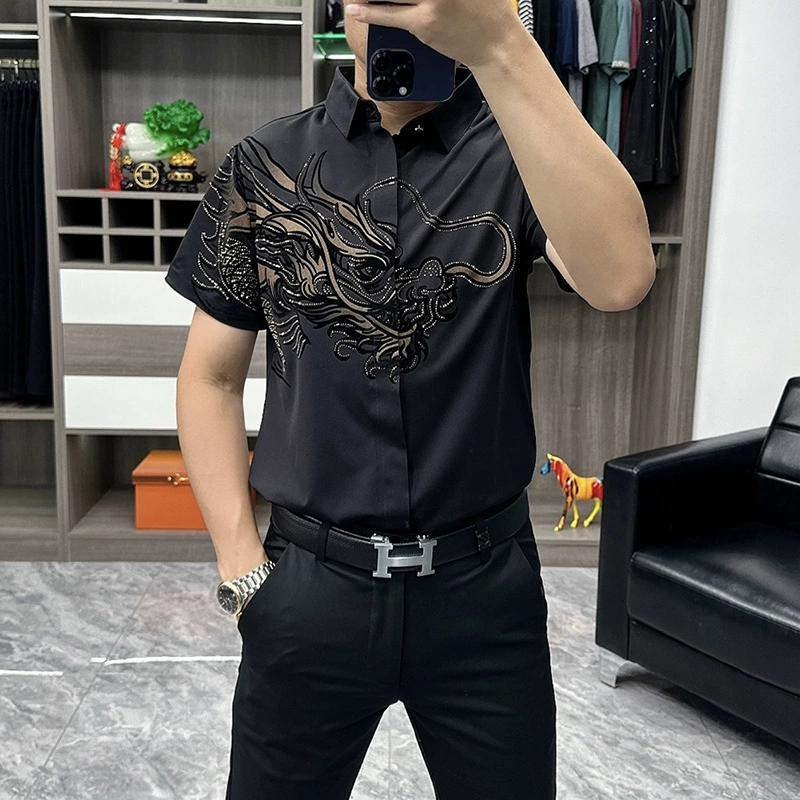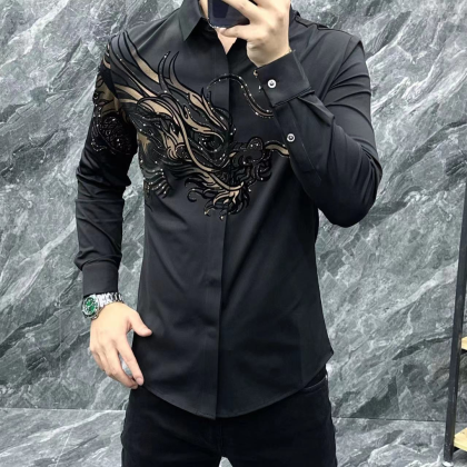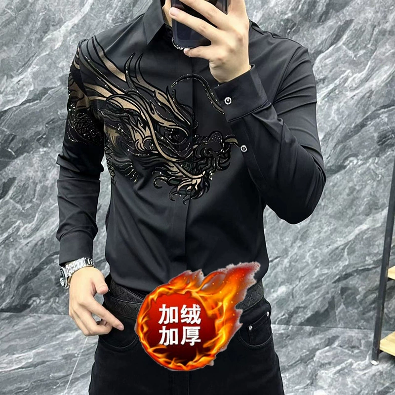 | nameOriginal | Autumn new handsome elastic fashionable business casual men's slim, seamless and versatile high-end hot rhinestone long-sleeved shirt |