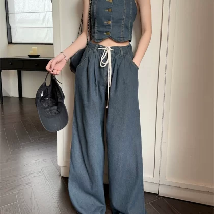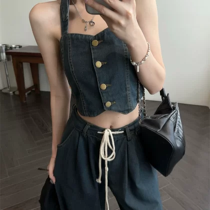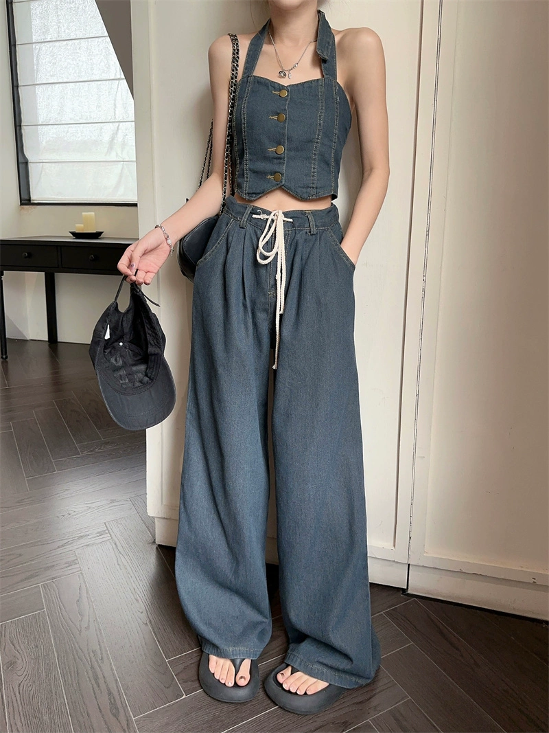| nameOriginal | Backless halter neck suspender drawstring jeans fashion set |