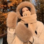 وشاح قبعة الدب متكامل للنساء للخريف والشتاء الدافئ لحماية الأذن، قفازات قطيفة لطيفة لركوب الدراجات مقاومة للبرد، مجموعة من ثلاث قطع