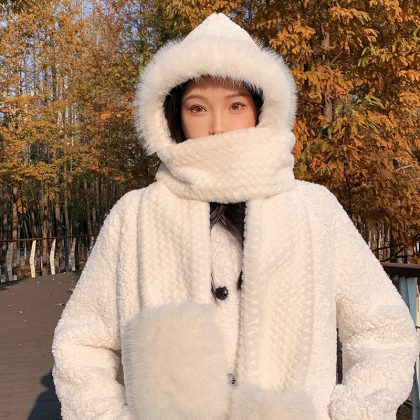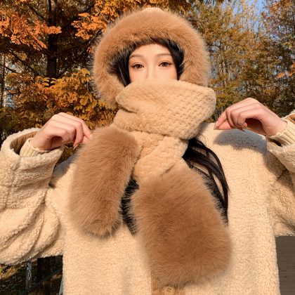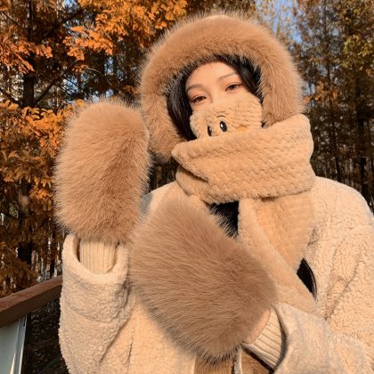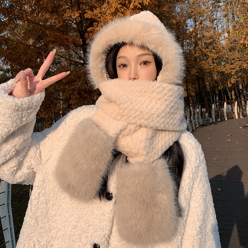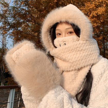 Bear hat scarf integrated women's autumn and winter warm ear protection cute plush gloves cycling cold-proof three-piece set
