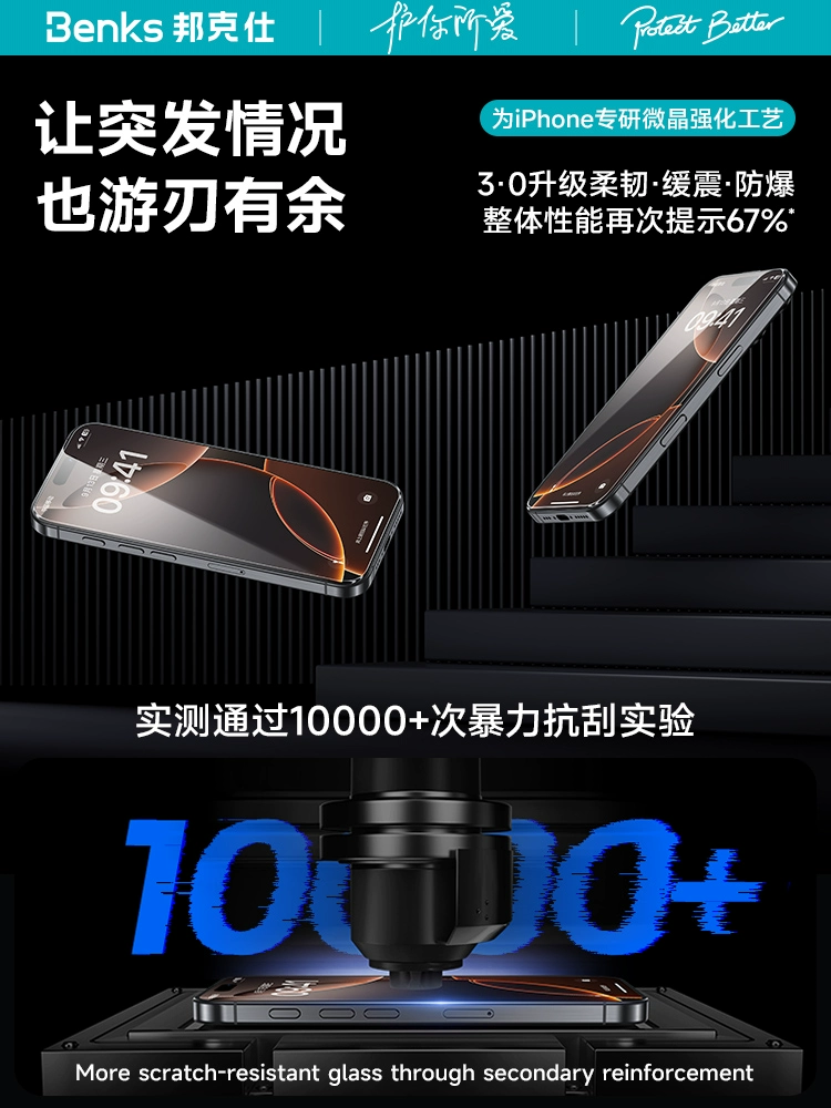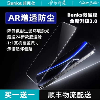 | nameOriginal | Benks is suitable for iphone16promax tempered film Apple 15por mobile phone film 14 full screen stickers 13 coverage 12 anti-peeping pm protection plus new AR anti-reflection ip dust-free warehouse 3d hot bending |