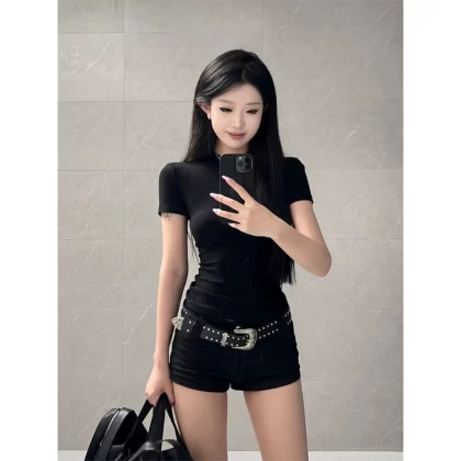 | nameOriginal | Black Half Turtle Neck Right Shoulder Hot Girl Slim Fit Short Sleeve T-Shirt |