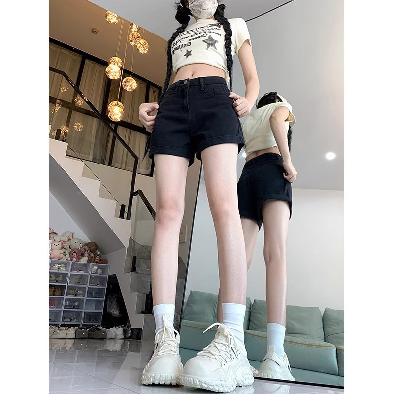 Black High Waist Curl Denim Shorts Women's Summer plus size chubby girl Slimming Pear Shape Wide Leg A- Shaped Hot Pants