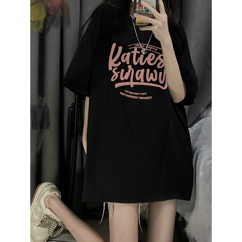 | nameOriginal | Black large size fat mm American style right shoulder pure cotton short-sleeved T-shirt women's summer oversize sweet and cool unique top |
