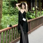Black loose pleated mid-length sleeveless v-neck suspender belt