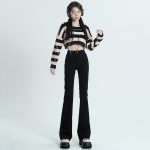 جينز أسود متوهج صغير للنساء لربيع وخريف 2024 سروال جديد عالي الخصر مرن طويل القامة ذو مظهر نحيف سروال حدوة حصان صغير