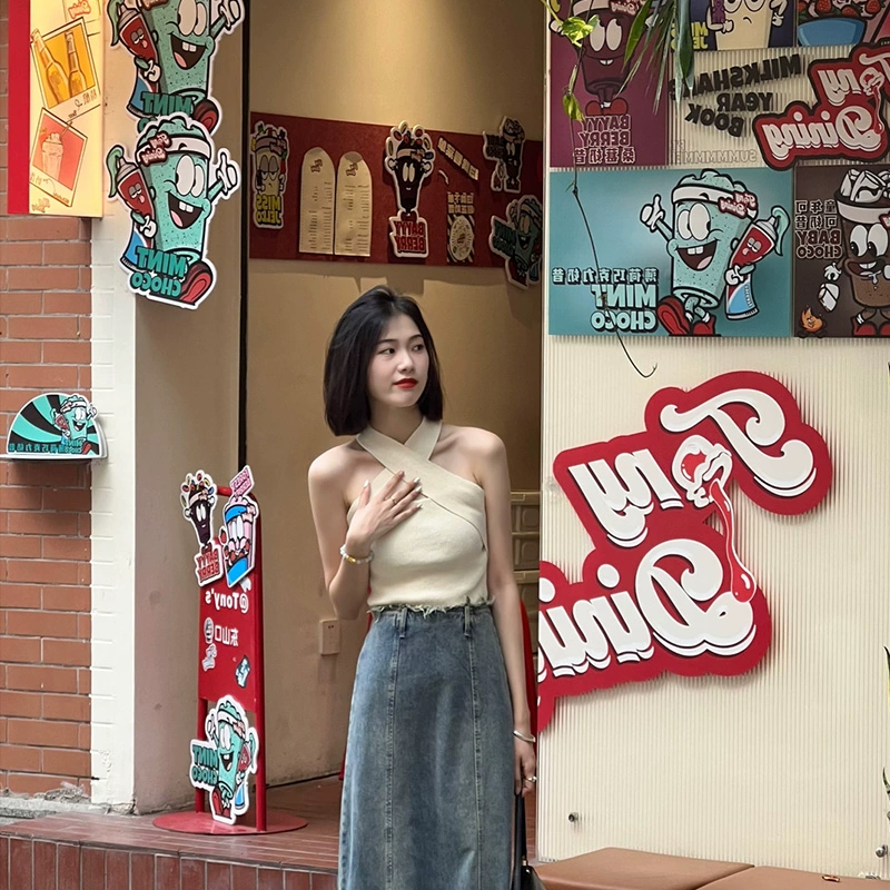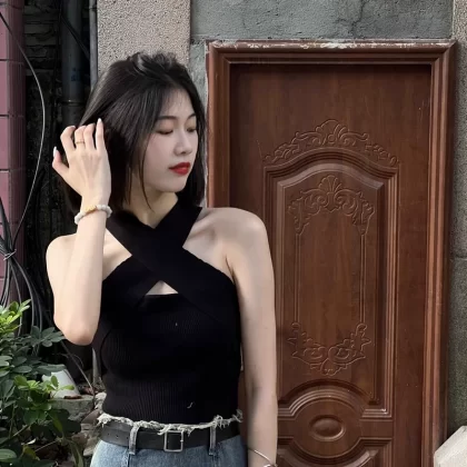 Black unique design niche sleeveless suspender halter neck