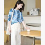 تي شيرت نسائي مخطط باللونين الأزرق والأبيض بأكمام طويلة أوائل ربيع 2024 تي شيرت غير رسمي جديد يناسب الجميع هذا العام قميص رفيع جميل مشهور هذا العام