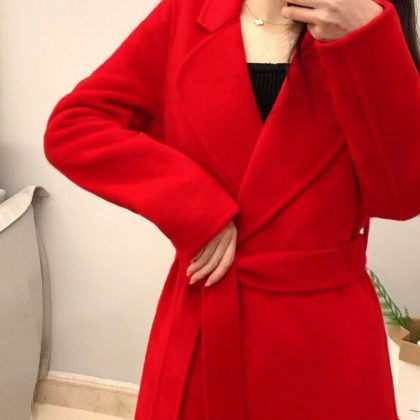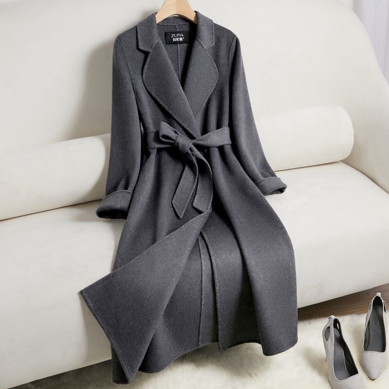 معطف كشمير أزرق على الوجهين للنساء طويل فوق الركبة وياقة جديدة وياقة نحيفة من الصوف معطف صوفي على الوجهين