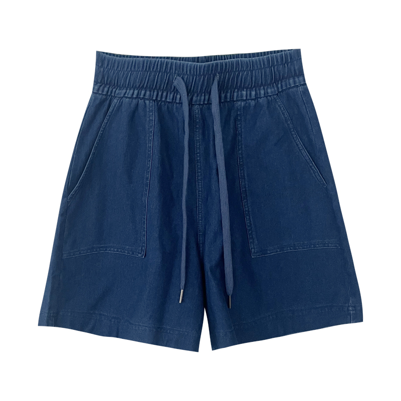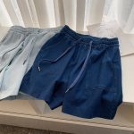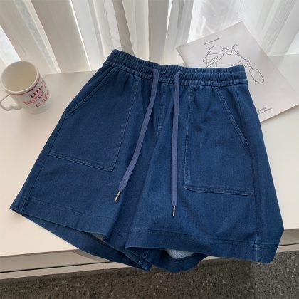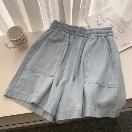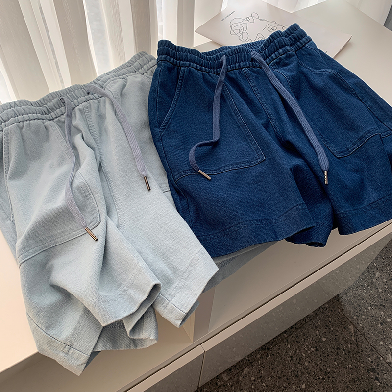 Blue Washed Cotton Straight Denim Shorts Women's Spring and Summer Thin Loose Slimming All-match Drawstring Wide Leg Casual Pants