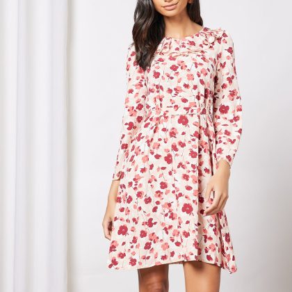 | nameOriginal | Casual Short Sleeve Knee Length Belted Woven Dress With Ruffle Round Neck Printed Pattern Blush |