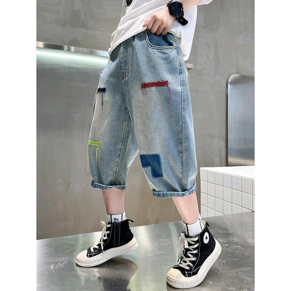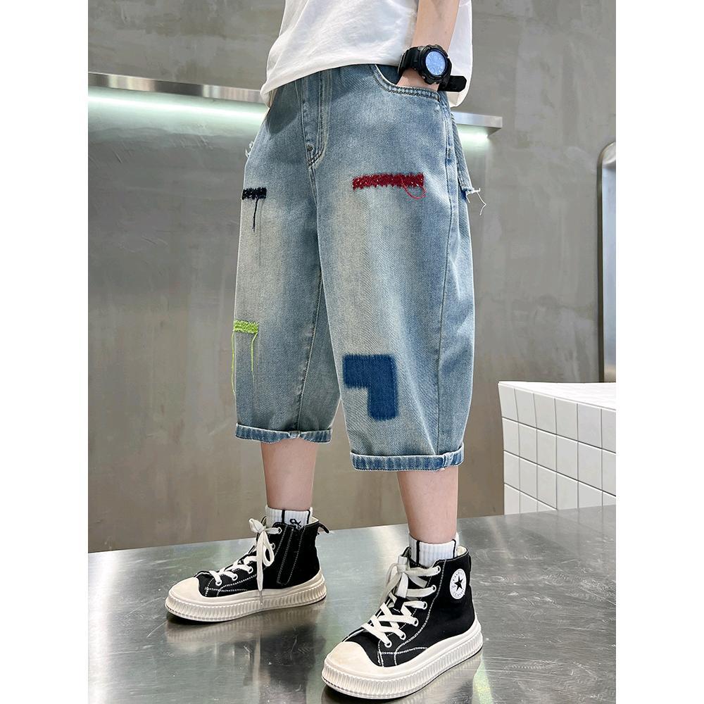 Boys' 2024 New Arrival Street-Fried Denim Pants Children's Big Kids Outer-Wearing Ripped Shorts Five-point Pants Capri-point Pants Trendy