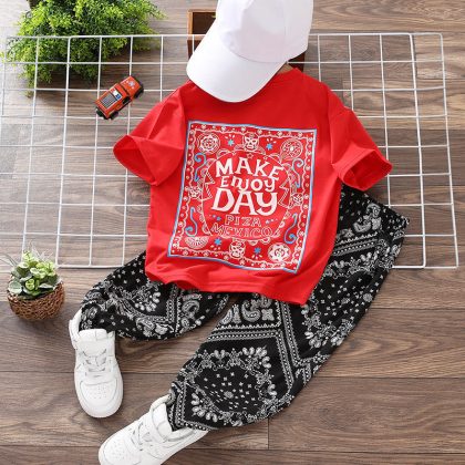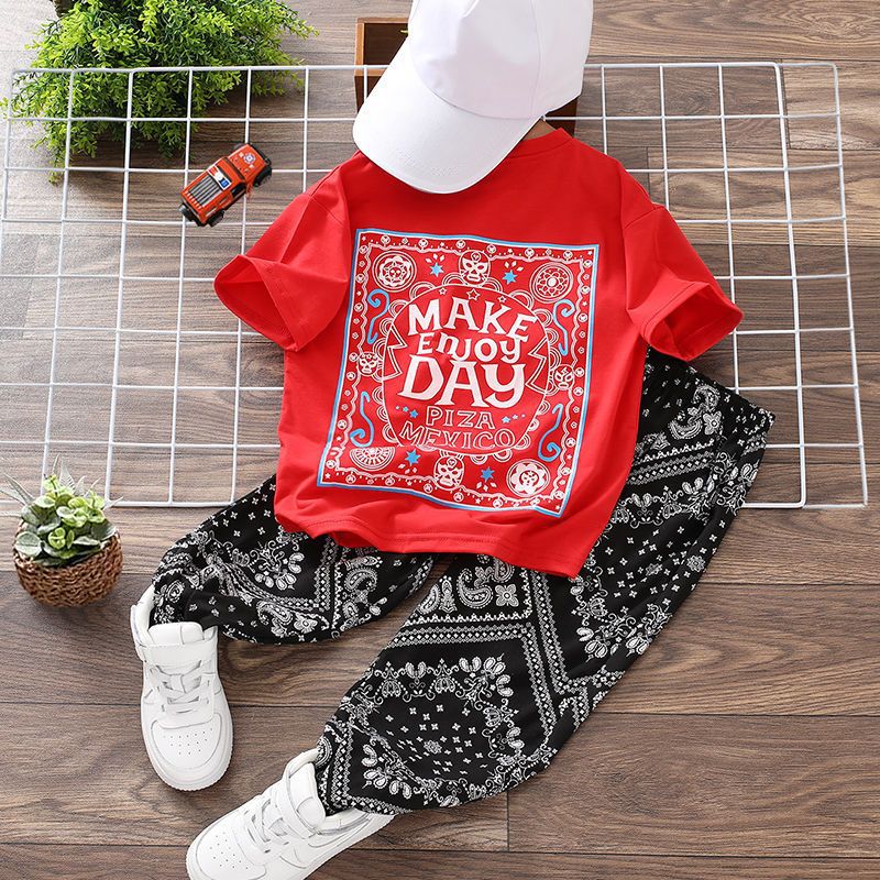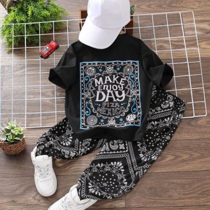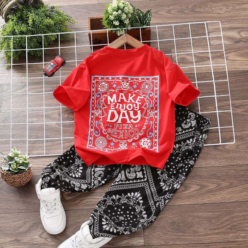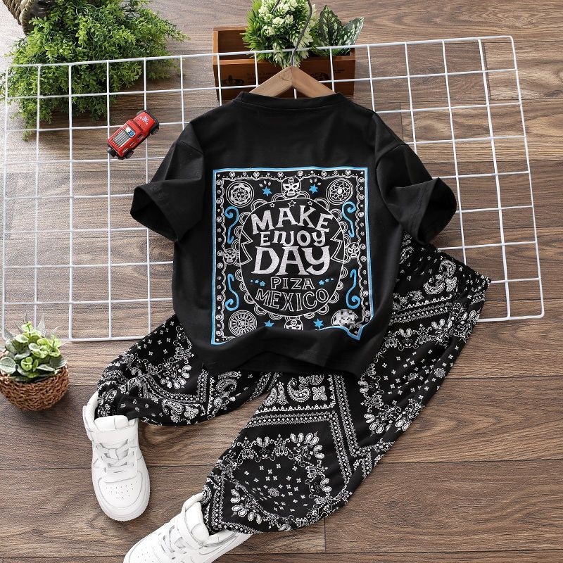 nameOriginal | Boys' Summer suit Children's Summer Thin Printed Cashew Flower Large Children's Short-sleeved T-shirt Long Cropped Pants Loose |