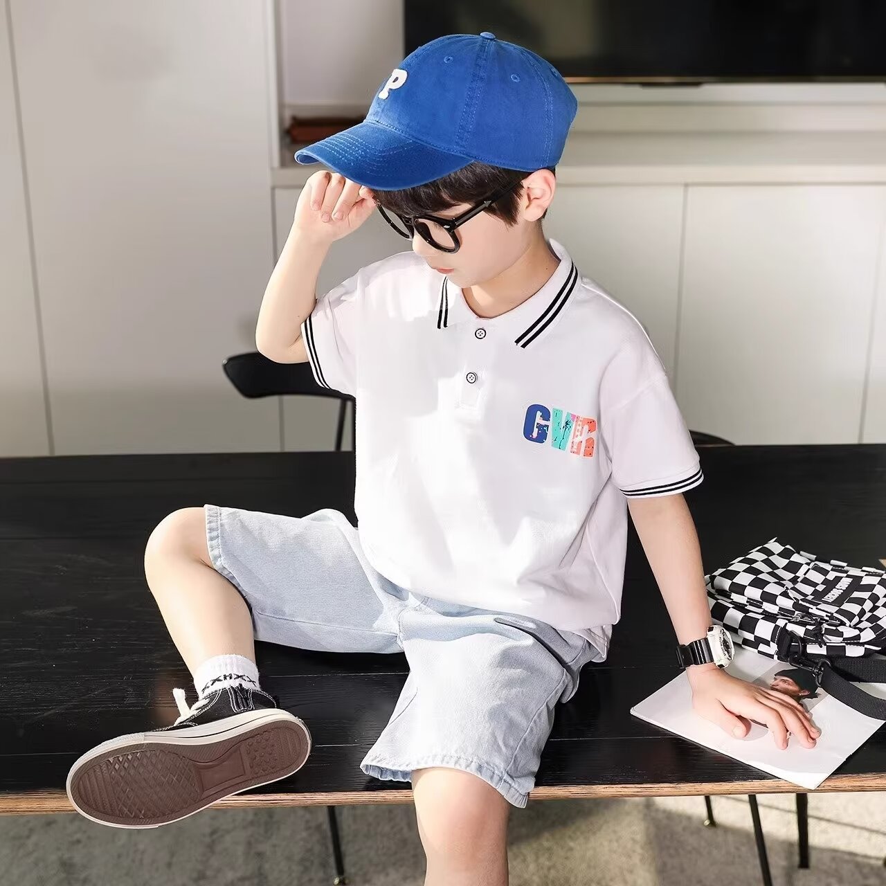 Boys T-shirt Summer 2024 New Children's Short-sleeved White Polo Shirt Large Children's Letter Printed Half-sleeved Top