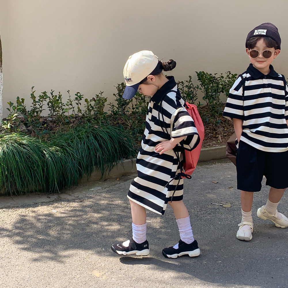 | nameOriginal | Brother and sister's 2024 summer boys' and girls' Korean version of loose polo collar small shirt striped dress end small Meng |