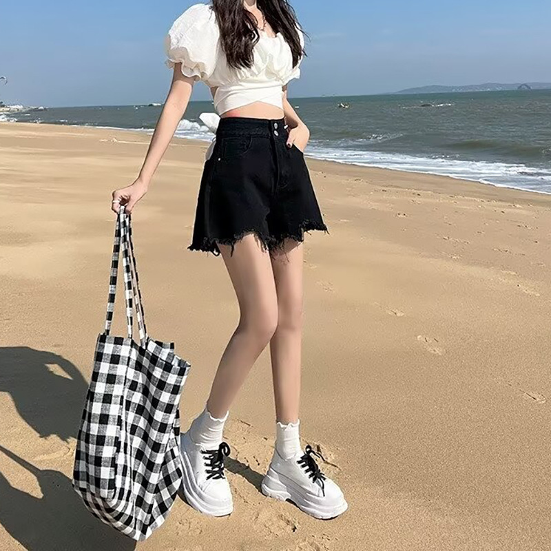 | nameOriginal | Casual Double Buckle Ruffled Denim Shorts Women's Summer New Loose High Waist A- Line Pants Black Leather Brand Hot Pants for Women |