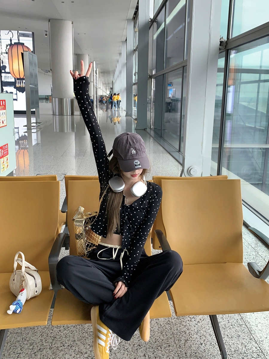 Casual polka dot cardigan suit drawstring trousers suspenders