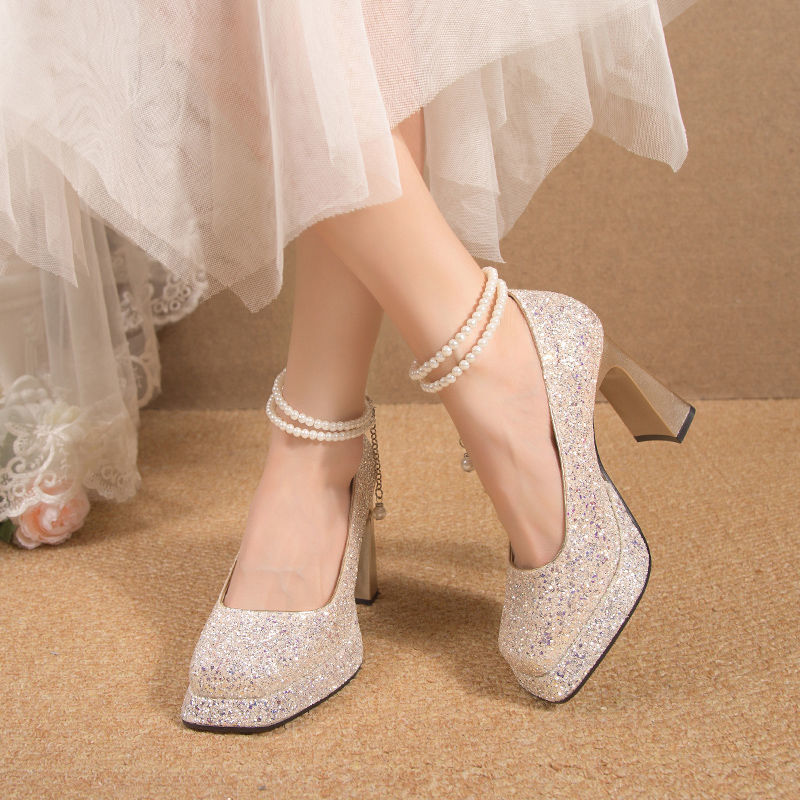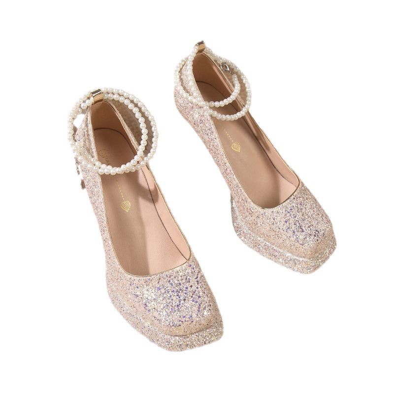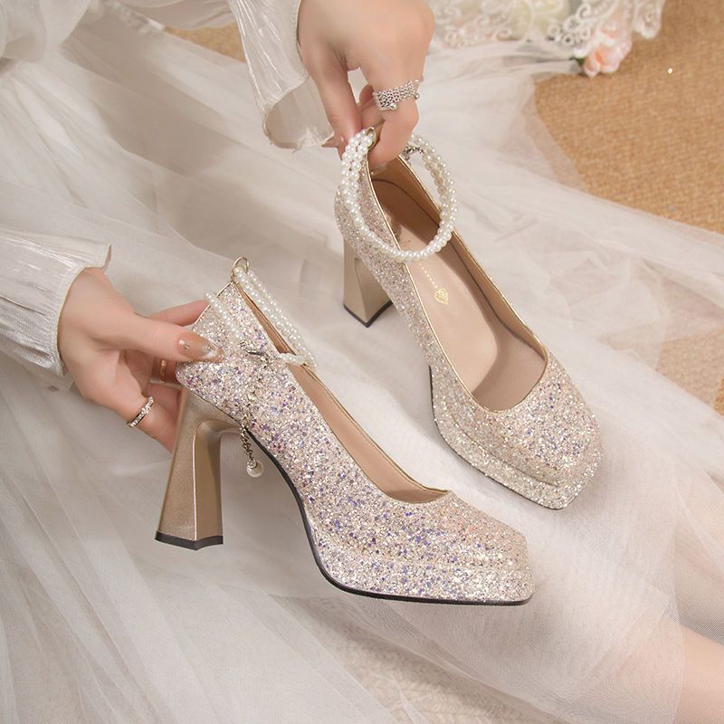 nameOriginal | Champagne Style Waterproof Platform Thick Heel New Mary Jane Crystal Shoes Wedding Shoes Bridal Shoes Square-toe High-heeled Shoes for Women |