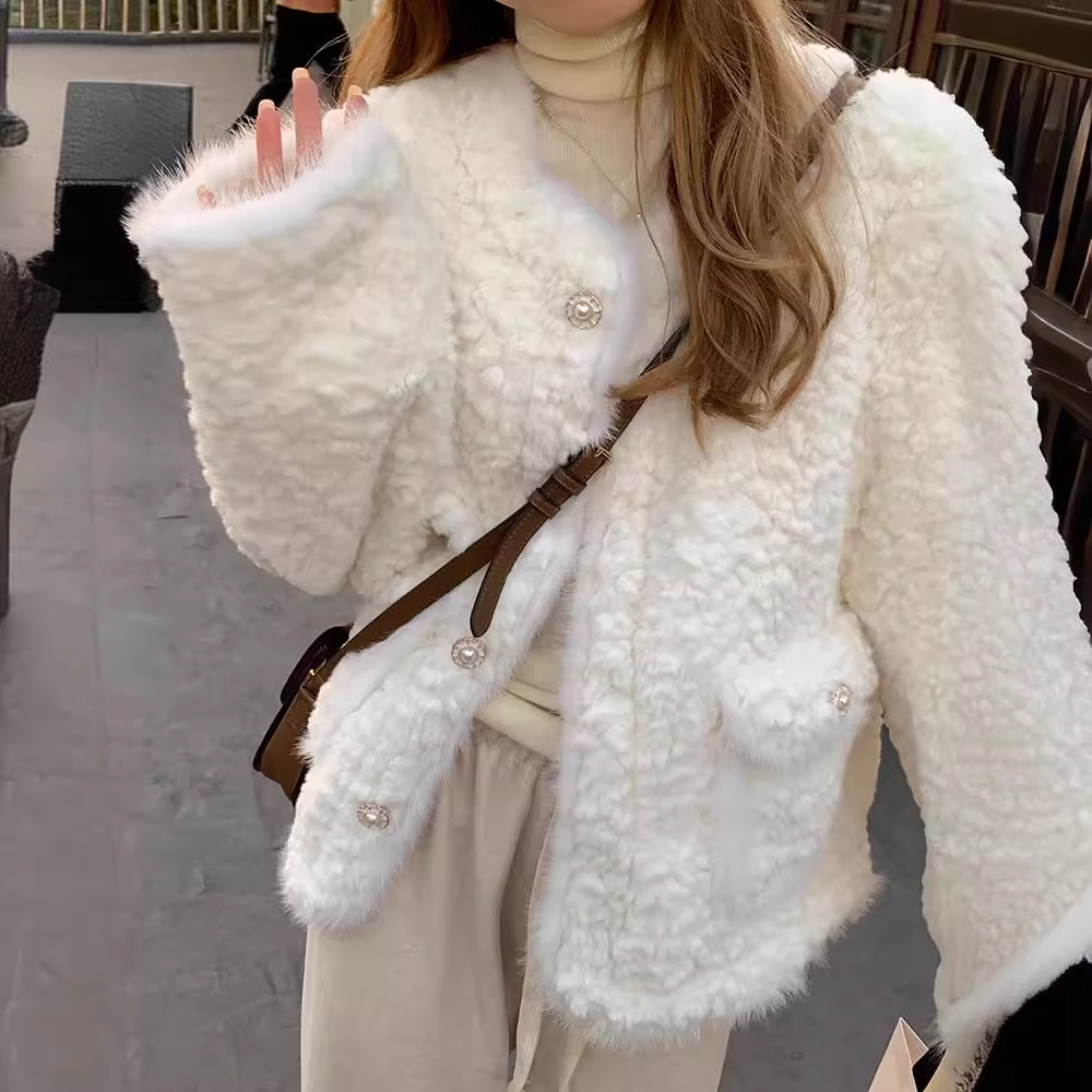 Chanel style coat for women 2023 New lamb fur imitation rabbit fur loose slimming warm high-grade plush top