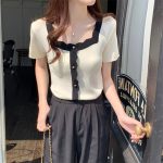 | nameOriginal | Chanel Style Square Collar Black Ice Silk Short-sleeved Knitted plus size Women's Summer Slim-fit Belly-covering French T-shirt Top |
