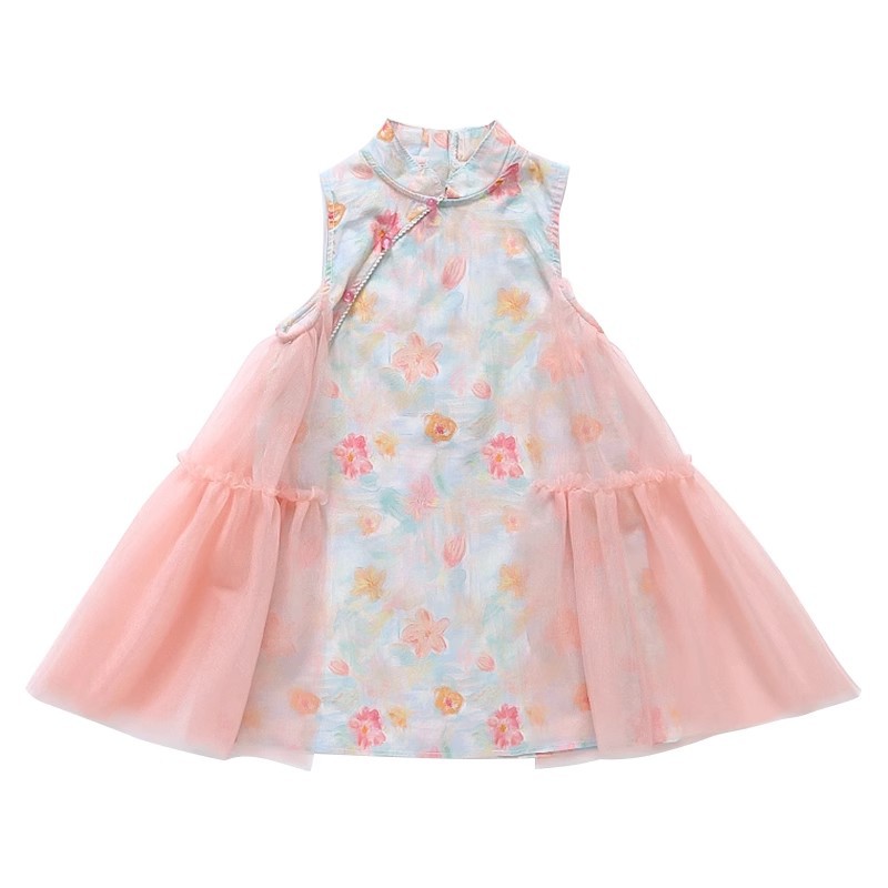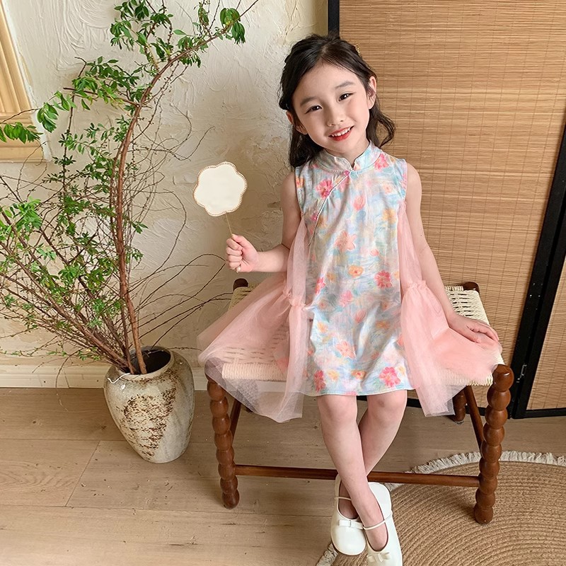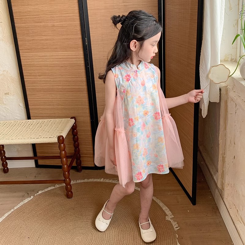 شيونغسام الفتاة النمط الوطني فستان صيف 2024 ملابس أطفال جديدة للأطفال فستان صيفي النمط الصيني الجديد تنورة الطفل العتيقة