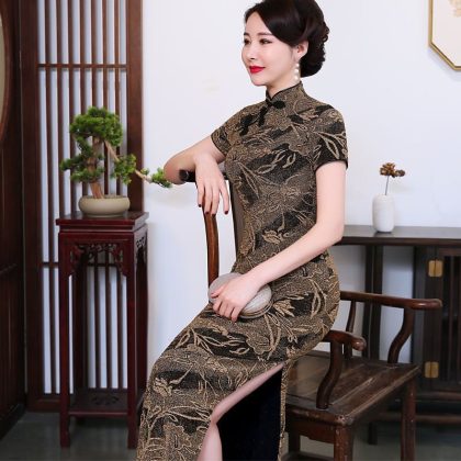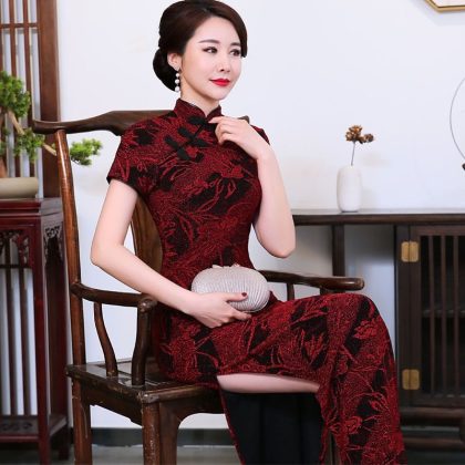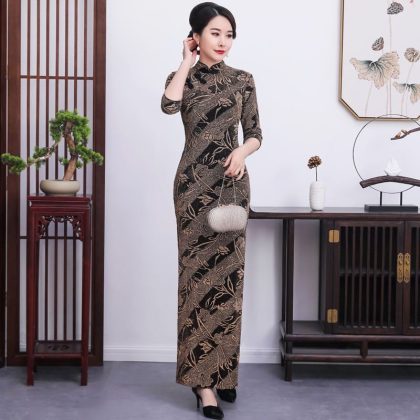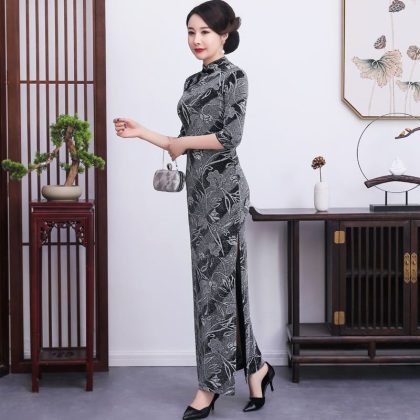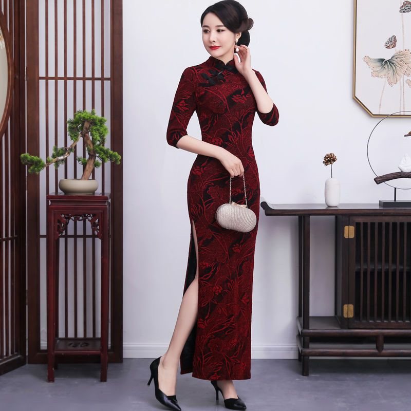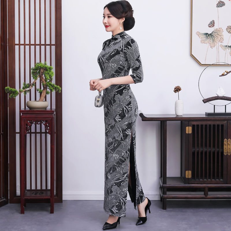 فستان Cheongsam النسائي الأنيق طويل للولائم بالإضافة إلى الحجم النحيف، فستان جاكار حريري لامع مائل جديد للربيع والخريف، أداء متوسط ​​العمر وكبار السن