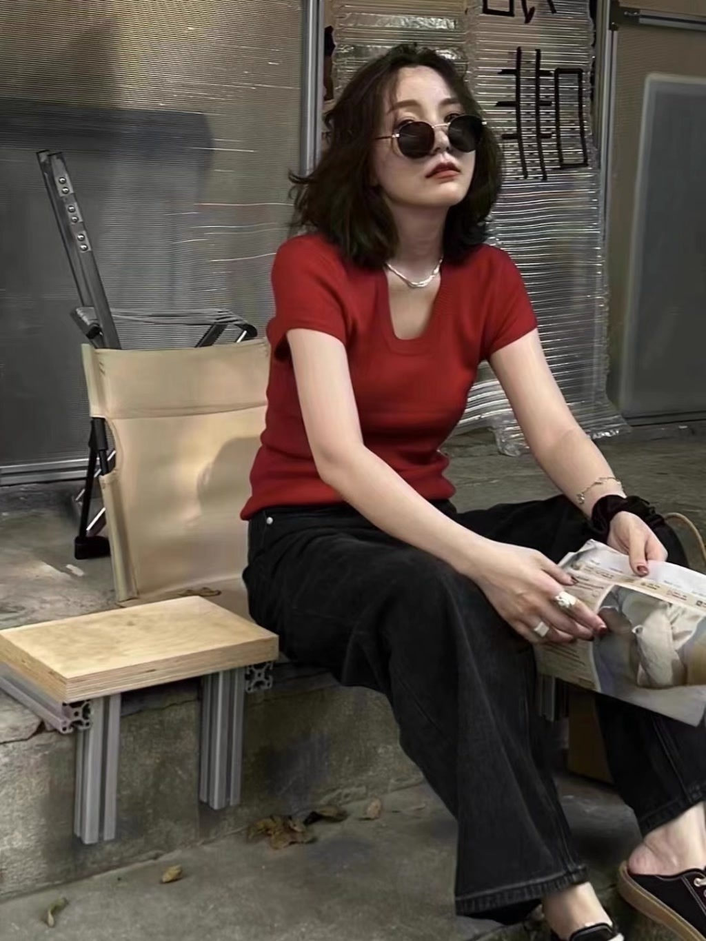 | nameOriginal | Chic and Beautiful Small Top Shoulder Slim U-Neck Small Flying Sleeve Summer Thin Knitted Short-Sleeved T-Shirt Women's 2024 New Style |