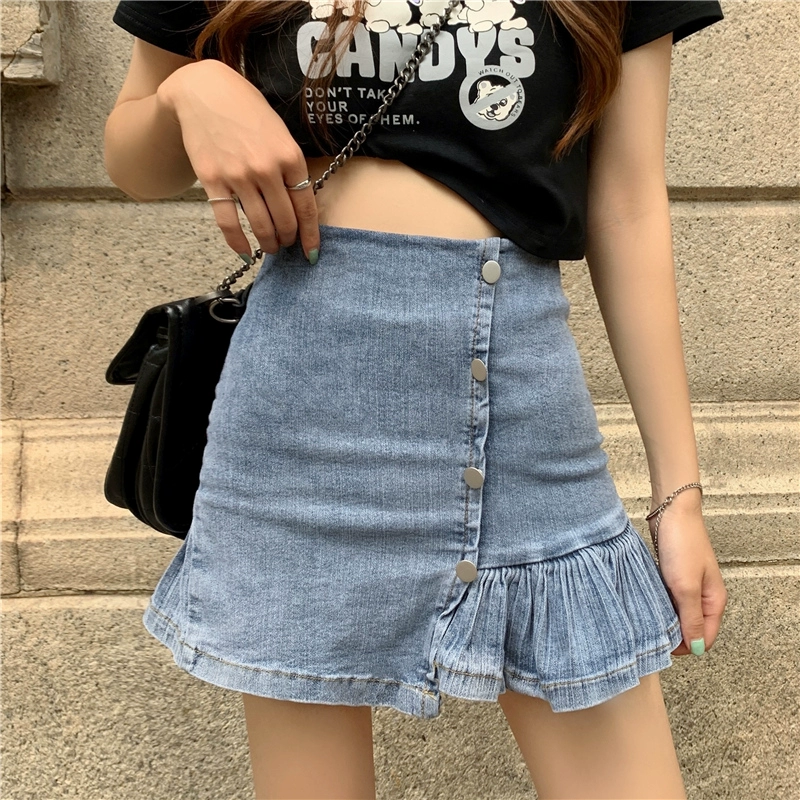 | nameOriginal | Chic Hong Kong style denim skirt women's summer design niche irregular high waist slimming A-line pleated skirt |