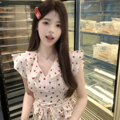 | nameOriginal | Chic peach heart lace-up Korean style slimming small flying sleeve shirt |