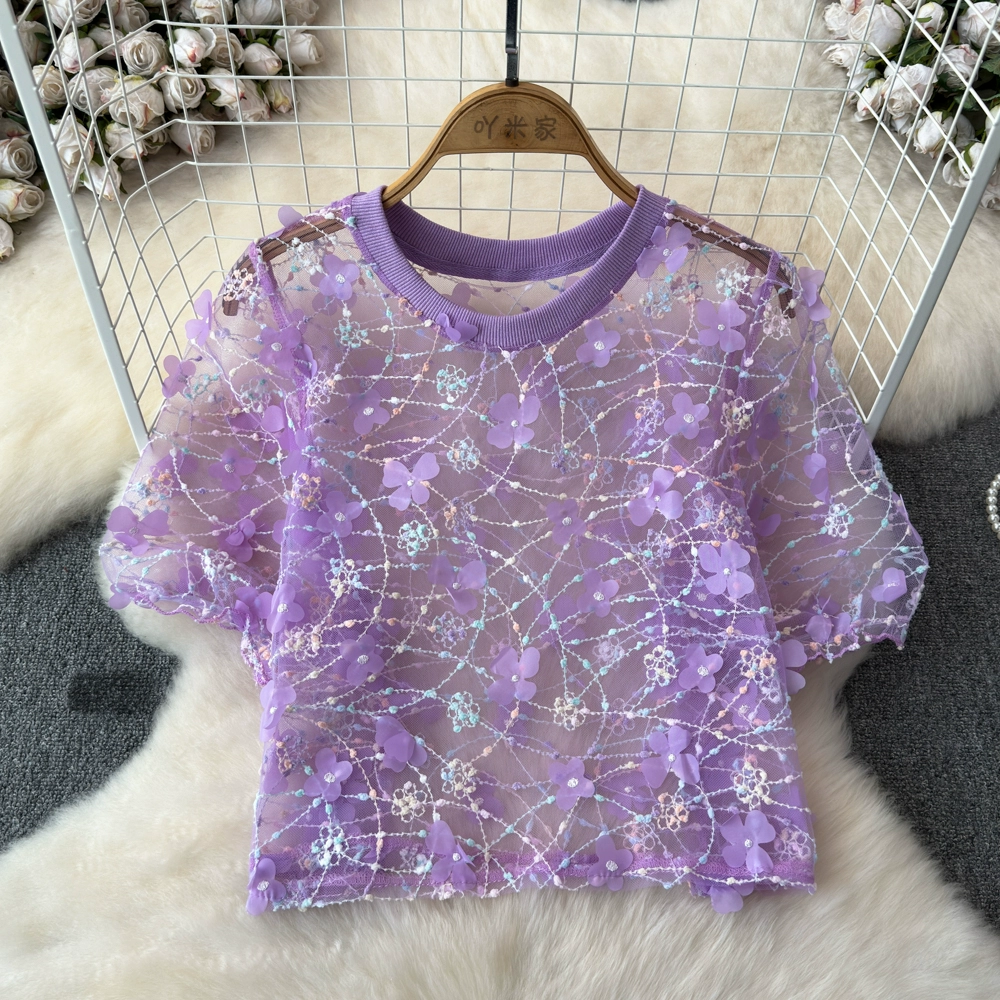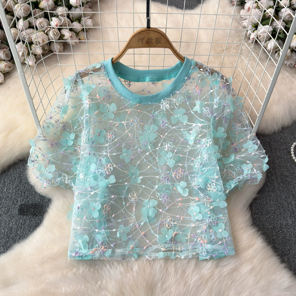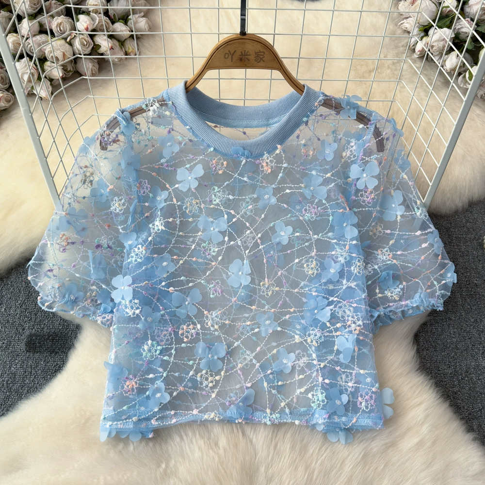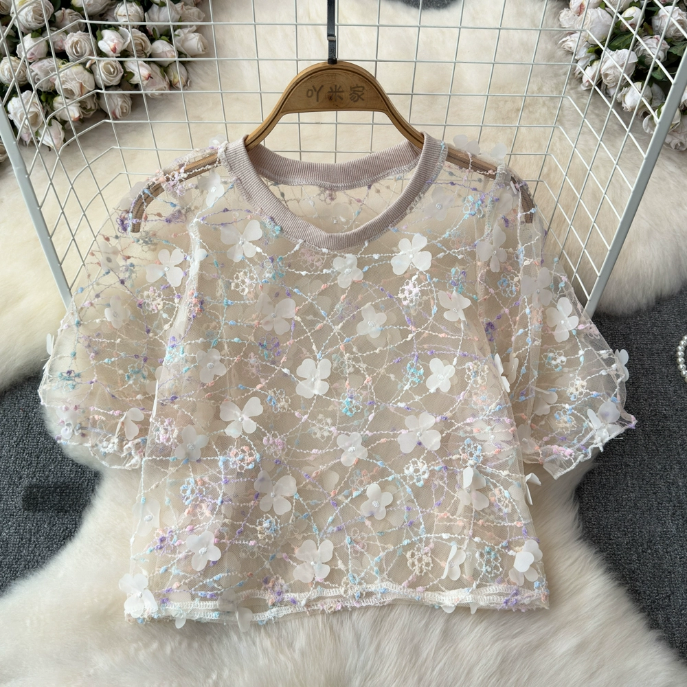 | nameOriginal | chic three-dimensional petal lace crew neck top mesh |