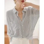 | nameOriginal | Chiffon drawstring hem short-sleeved loose striped shirt |