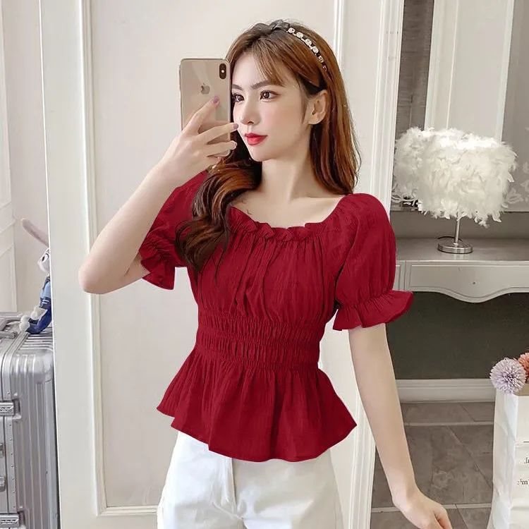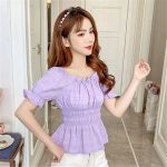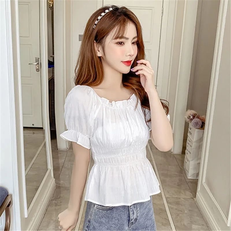 قميص شيفون بأكمام قصيرة صيف جديد 2024 نمط كوري ضيق الخصر التخسيس بلون مطوي الكتف المرأة قميص صغير