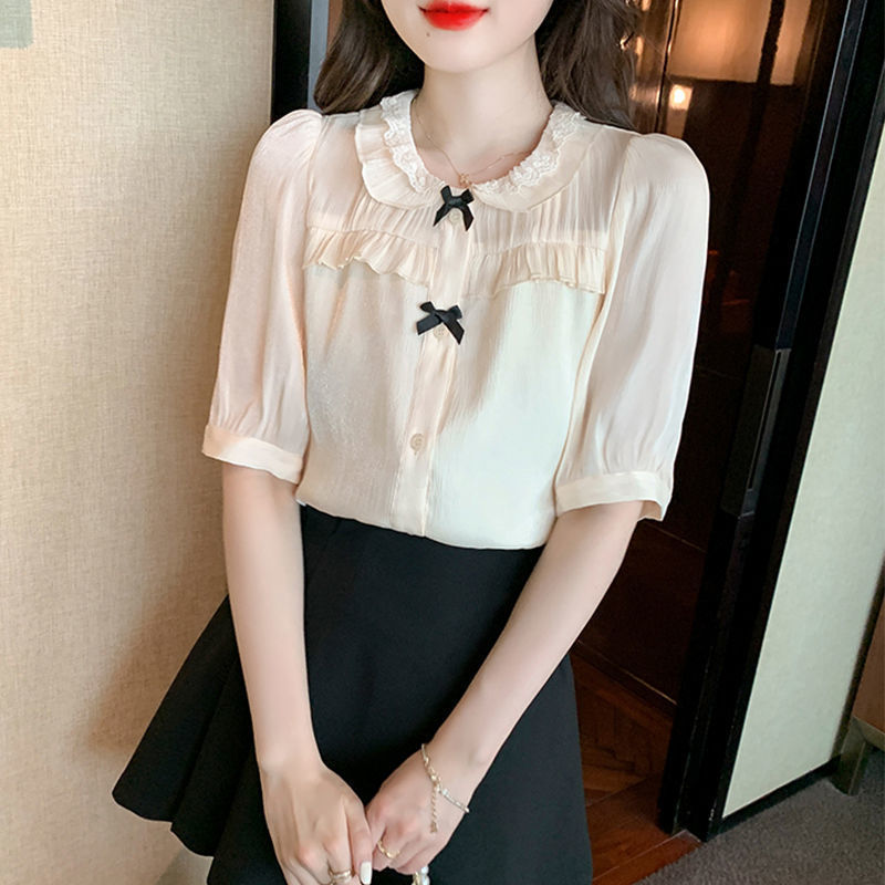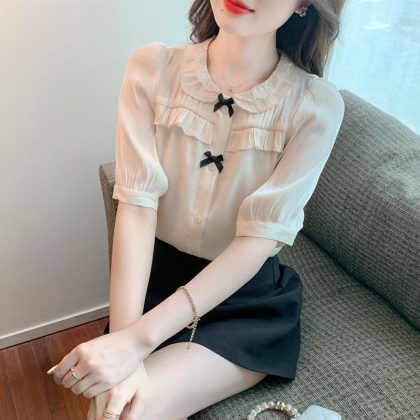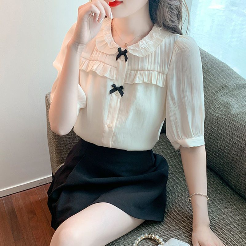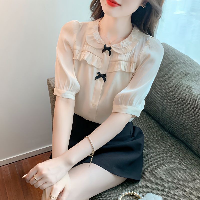 قميص شيفون نسائي 2024 صيف جديد على الطراز الفرنسي تصميم لطيف للحس المتخصص وياقة الدمية المكشكشة بلوزة أنيقة