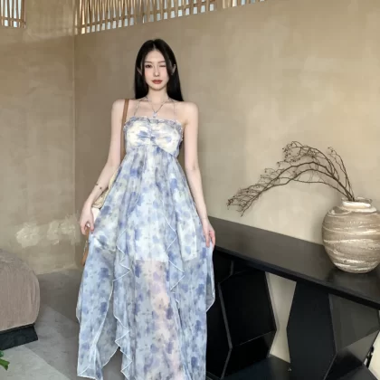 Chiffon summer sheer backless a-line skirt with halter neck straps
