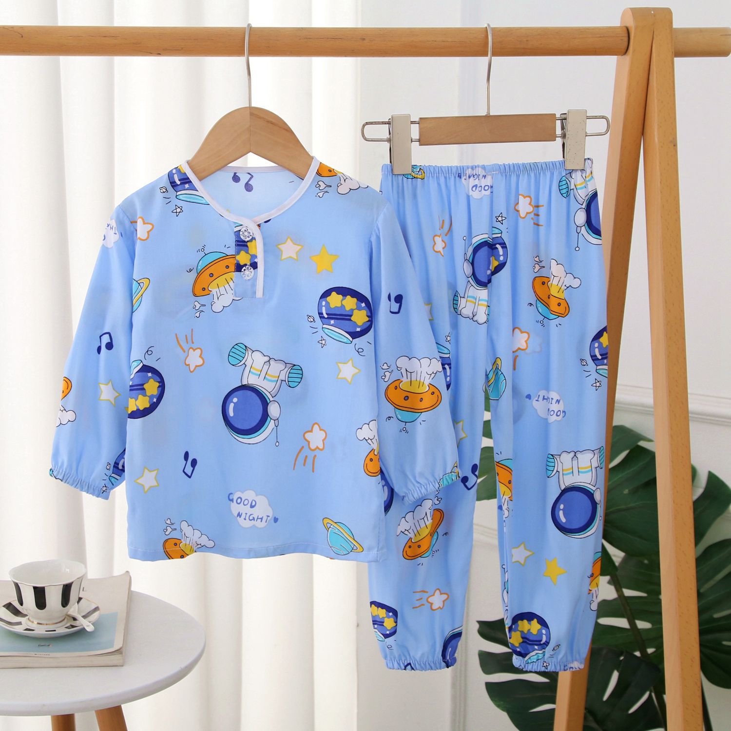 | nameOriginal | Children's cotton pajamas thin long sleeve suit boys and girls baby artificial cotton silk mosquito-proof home wear spring and summer |