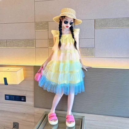 فساتين الأطفال النسائية 2024 الجديدة للفتيات كعكة التنانير الكبيرة للأطفال ملابس الصيف التنانير الفتيات الصيف الحمالات التنانير