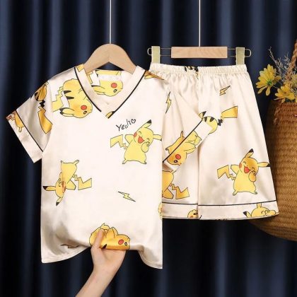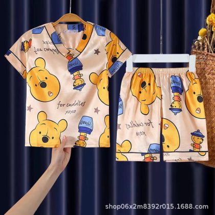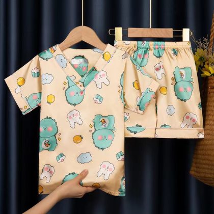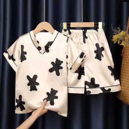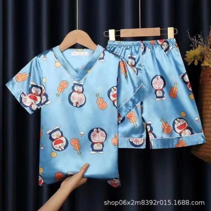 بيجامات أطفال صيفية من الحرير الجليدي بأكمام قصيرة ورقيقة للأطفال الأولاد والبنات ملابس تكييف هواء للأطفال متوسطة وكبيرة بدلة ملابس منزلية