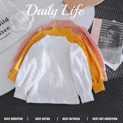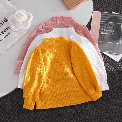 Children's puff sleeve top new girls' knitted bottoming shirt with lace collar top for girls spring and autumn Korean style