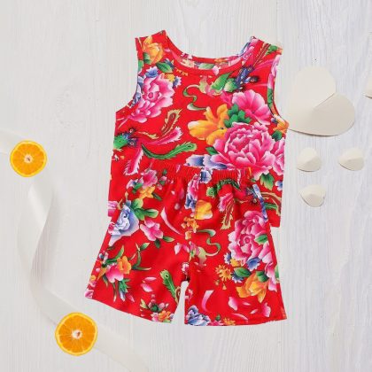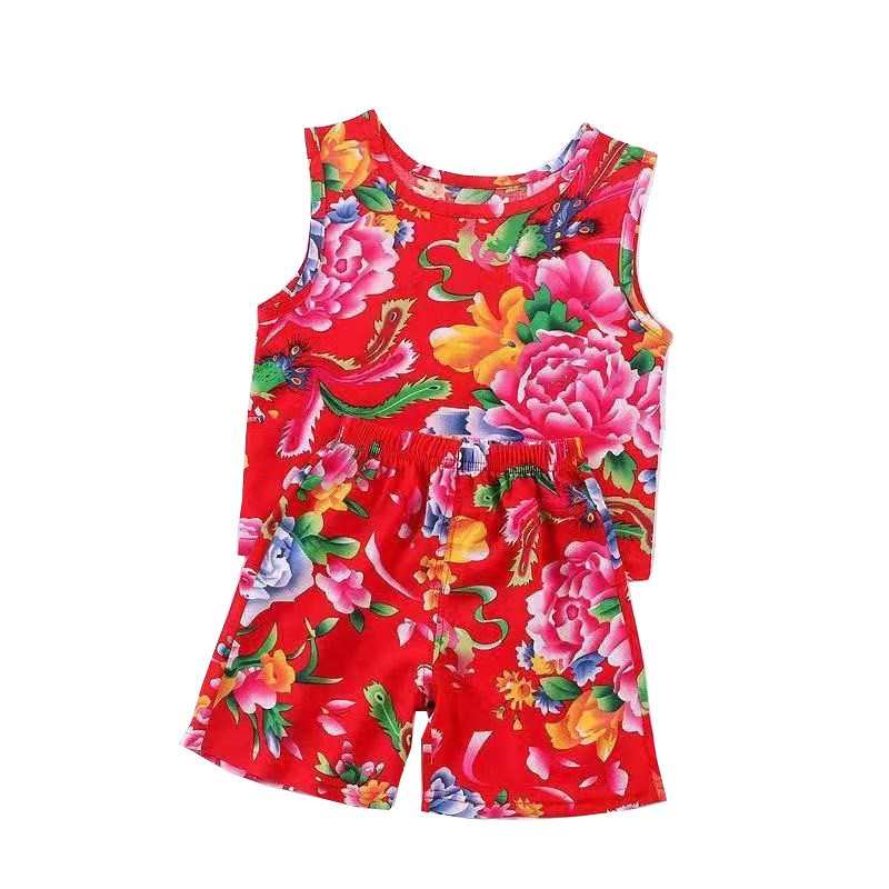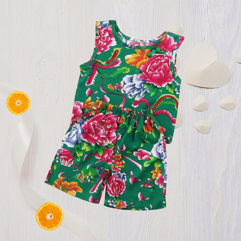 Children's Sling suit Boys and Girls Thin Cotton Silk Vest Shorts Two-piece Set Internet Popular Baby's Northeast Flower suit